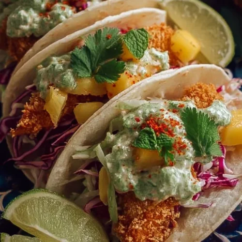 - Assemble tacos: layer shredded cabbage, panko-crusted fish, a spoonful of pineapple salsa, and a drizzle of creamy cilantro-lime sauce. Finish with a squeeze of lime and serve immediately.