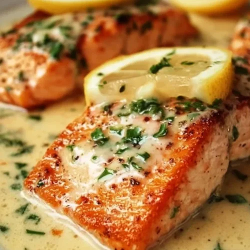 This dish is simply salmon fillets marinated briefly in a bright lemon-Dijon mixture, baked until just opaque, then finished with a luscious lemon butter cream sauce. The flavor balances bright acidity (lemon) with savory depth (Dijon, garlic) and rich creaminess (butter and heavy cream). The cooking method is straightforward: a quick marinade followed by roasting in a skillet or baking dish at high heat (425°F / 220°C) so the salmon cooks quickly and stays moist. People often serve this for weeknight dinners, simple entertaining, or even a slightly elevated brunch when paired with soft polenta or wilted greens. The overall vibe is comforting and refined—comfort food with a light, elegant touch.