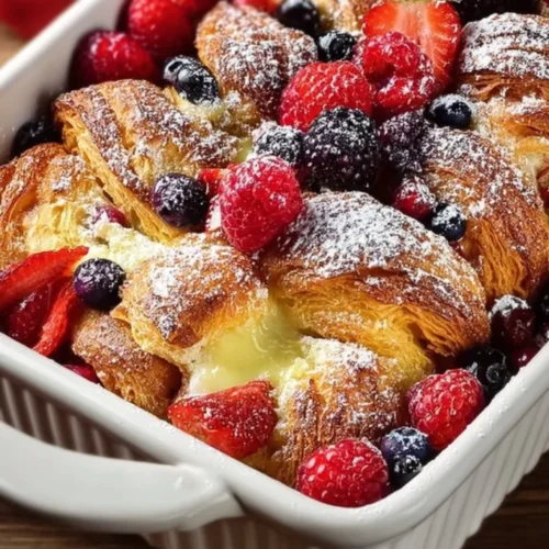 A delightful Berry Croissant Bake filled with creamy cheese and juicy berries, perfect for breakfast or brunch.