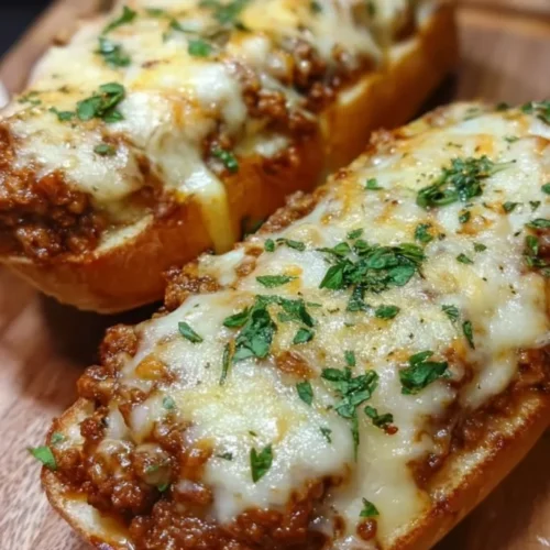 This is a hybrid comfort dish that layers a classic sloppy joe filling — seasoned ground beef in a tangy-sweet tomato-based sauce — onto halved ciabatta loaves that have been buttered and seasoned with garlic powder. It’s finished under a broiler or in a hot oven with a generous blanket of shredded mozzarella and sharp cheddar until bubbling and golden.