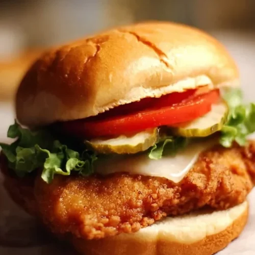 Serve this sandwich as a main course with classic sides like waffle fries, coleslaw, or a simple green salad. For a fun twist, pair it with a crisp slaw piled on top for extra texture, or turn the breasts into sliders for parties.
