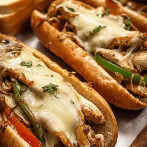 This recipe is straightforward: you brown the thinly sliced chicken, then soften onions and peppers in the same skillet so everything picks up caramelized flavor. Topping the cooked mix with provolone and covering briefly creates the classic melty cheese texture. Finally, transfer to hoagie rolls and serve immediately so the cheese stays warm and stringy. Total active cook time is roughly 15–20 minutes, making it a fast option for busy evenings.