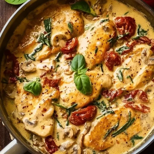 The first time I made this creamy Tuscan chicken, the house smelled like a trattoria within minutes — garlicky, cheesy, and bright with cherry tomatoes. It’s a simple skillet dinner that feels indulgent but comes together quickly, perfect for busy weeknights or a cozy weekend meal. If you prefer a baked version, try our baked Tuscan chicken for an oven-friendly twist.