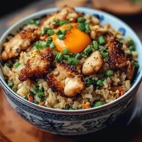 Crispy Garlic Chicken Fried Rice Bowl is a quick skillet meal built around diced chicken breasts, fragrant garlic, cooked rice, soy sauce, and mixed vegetables. The chicken is seared until golden for a pleasant crisp texture, then combined with garlic to release aroma and flavor. Adding cooked rice lets the grains soak up soy sauce, making every bite savory and slightly caramelized where it touches the hot pan. It’s typically served hot in a bowl and garnished with green onions for freshness.