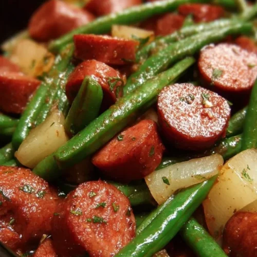 - Veg-forward version: increase green beans and add sliced bell pepper or mushrooms; use vegetarian smoked sausage for a meatless plate.