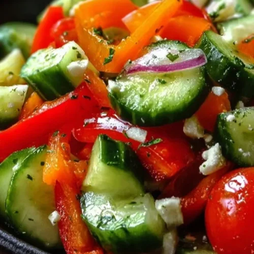 A refreshing and colorful salad made with crisp cucumbers, sweet bell peppers, and cherry tomatoes, tossed in a simple vinaigrette, perfect for summer barbecues and light lunches.