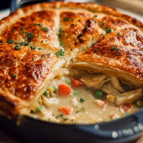 This recipe balances convenience and classic comfort. You get the silky, lightly thickened sauce that makes pot pie so satisfying, the convenience of shredded cooked chicken (rotisserie is a time-saver), and the rustic, homey look of a pie baked in—or transferred from—a Dutch oven. It’s family-friendly, forgiving on timing, and scales easily for guests.