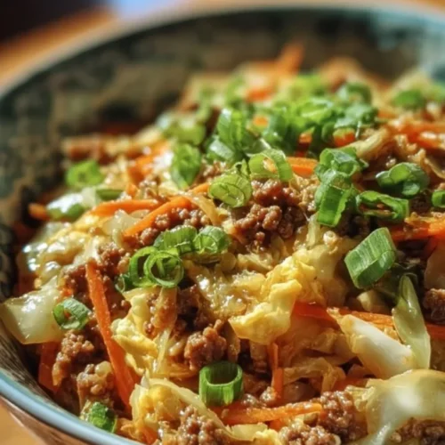 Egg Roll in a Bowl is a deconstructed egg roll—everything you’d expect from the filling of an egg roll cooked together in a skillet without the wrapper. It tastes savory and slightly sweet with a toasty sesame finish and a bright hit of rice vinegar. The cooking method is simple sautéing: brown the ground meat, aromatics go in next, then shredded cabbage is quickly wilted while preserving a little crunch. People often serve it as a weeknight dinner, quick lunch, or meal-prep staple; it’s cozy and efficient, leaning into comfort food territory without being heavy. Think of it as the easy, unwrapped cousin of takeout egg rolls.