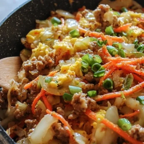 Egg Roll in a Bowl (One-Skillet, Keto) is a deconstructed egg roll served as a skillet meal. Instead of wrappers and frying, the classic egg roll fillings—ground meat, cabbage, carrots, green onions, garlic, and ginger—are sautéed together with soy and sesame for the signature flavor without the extra carbs. It tastes savory and slightly sweet with warm aromatics and a toasty sesame note. The method is simple: brown the meat, add aromatics, then toss in the veggies and sauce, cooking until crisp-tender. People often serve it for busy weeknights, meal prep lunches, or a cozy solo dinner—basically anytime you want all the comfort of an egg roll without the work.