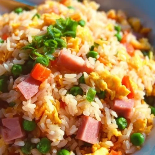 This recipe is straightforward: pre-cooked rice gets stir-fried with diced ham and mixed veggies, finished with scrambled eggs, soy sauce, and scallions. Work on medium-high heat, keep things moving to avoid steaming, and add the eggs to one side of the pan so they scramble quickly without overcooking the other ingredients.