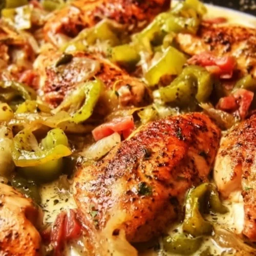 This pepperoncini chicken skillet pairs tangy jarred peppers with a silky cream sauce for a one-pan dinner that’s fast enough for weeknights but flavorful enough for guests. Cubed chicken browns quickly, the reserved pepperoncini juice deglazes the pan, and a little cream ties everything into a cozy sauce—serve it over pasta or rice for an all-in-one plate. If you like bold, simple chicken dinners, try the Bobby Flay chicken thighs recipe for another easy skillet option with a different flavor angle.