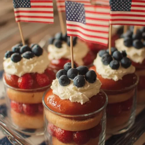 A vibrant and playful dish perfect for Independence Day celebrations, featuring layers of fresh strawberries, blueberries, and whipped cream or yogurt, making it look festive and tasty.