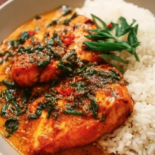 You’ll start by making a smooth curry sauce with coconut milk, red curry paste, fish sauce, lime juice, and a touch of sugar. The salmon fillets sit in that sauce and bake gently, absorbing flavor while staying tender. Meanwhile, sauté the bell peppers until they soften, then wilt the spinach. Finish by plating the salmon over rice and spooning the pan sauce and vegetables on top.