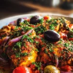 Notes/substitutions: swap bone-in thighs for more flavor (increase cooking time slightly). For a dairy touch, top with crumbled feta just before serving. If you don’t have kalamata, use Castelvetrano or Castelvetrano-like green olives for a milder taste.