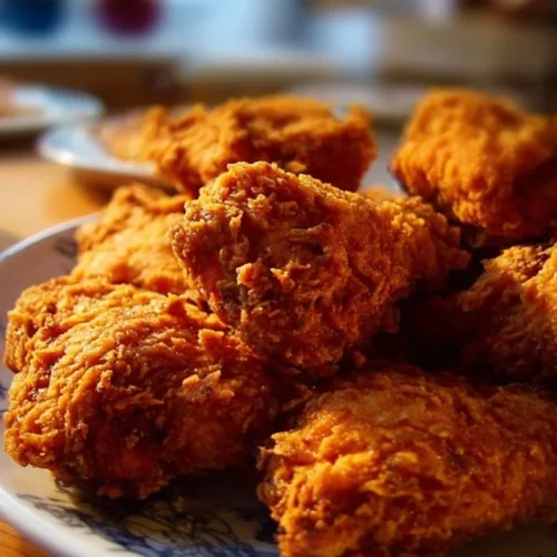 - Fry: Carefully place chicken pieces into the hot oil, skin-side down if applicable. Don’t overcrowd — work in batches. Fry each piece about 15–20 minutes, turning occasionally, until the crust is deep golden and a thermometer in the thickest part reads 165°F (74°C).
