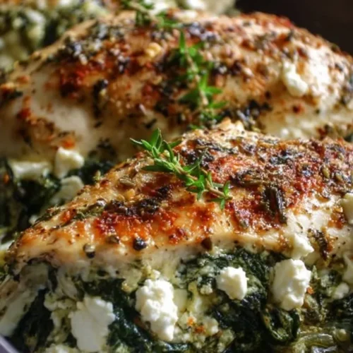 This Spinach and Feta Baked Chicken features a creamy filling of spinach, feta, and cream cheese, melted over tender baked chicken, making it a quick and elegant dinner option.