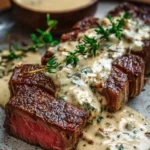 A perfectly seared, thick-cut steak finished with a silky, garlicky cream sauce — simple, indulgent, and exactly what dinner should feel like on a weeknight or a special occasion. This recipe uses a single thick ribeye, sirloin, or filet mignon, seared to your preferred doneness and topped with a quick Parmesan–garlic cream that takes minutes but tastes like you spent hours. If you love rich pan sauces, this will become a go-to; for more creamy sauce inspiration in other meals, check a favorite creamy pairing here: creamy gnocchi with spinach and feta.