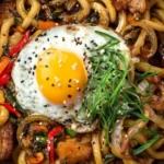 This Yaki Udon is the ultimate quick and flavorful stir-fry you’ll want on repeat. With tender beef, chewy udon noodles, garlicky greens, and a glossy soy-based sauce, it’s hearty yet comes together in less than 30 minutes. The finishing touch? A perfectly fried egg on top, adding richness to every bite.