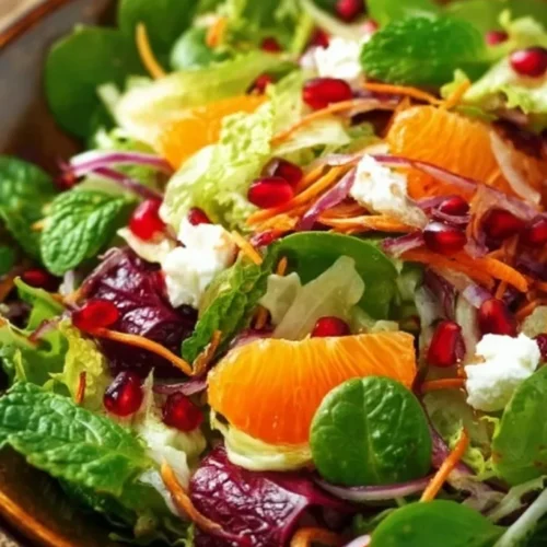A bright, seasonal salad that feels like sunshine on a winter plate — crisp spring greens tossed with juicy orange segments, ruby pomegranate seeds, tangy crumbled feta, and crunchy candied pecans. A simple olive oil–balsamic-honey dressing ties everything together in minutes, so this is one of those salads you can bring to a holiday table or pull together for a weeknight when you want something fresh and celebratory. If you enjoy citrus-forward salads at this time of year, you might also like the playful presentation of a Caprese salad Christmas tree for holiday entertaining.